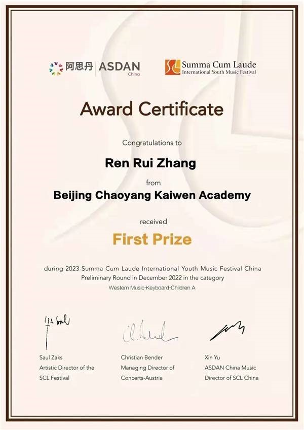 报喜2023 新年伊始,朝阳凯文的同学们在音乐、数学、化学三项赛事中崭露头角,收获满满,喜报连连!三项重磅奖项分别是: 维也纳国际青少年音乐节一等奖 美国少年化学家趣味活动优秀奖 北美数学联盟竞赛2金5铜 在朝阳凯文,学校一直鼓励并带领同学们参与国际竞赛,让竞赛不再是尖子生的专属,而是每一位孩子都可以参与其中,充分发挥他们的兴趣特长,在不同的领域发光发热,收获自信和成长。 今天,就让我们一起看看凯文小将们在2023年,收获了哪些惊喜吧! 维也纳国际青少年音乐节一等奖 朝阳凯文3年级张壬睿同学在2023冬季“至高荣耀”维也纳国际青少年音乐节(线上雨轩站)活动中,获得西洋乐初赛一等奖的好成绩,顺利进入全国总决赛,并有机会获得2023年暑假前往维也纳金色大厅的演出机会!